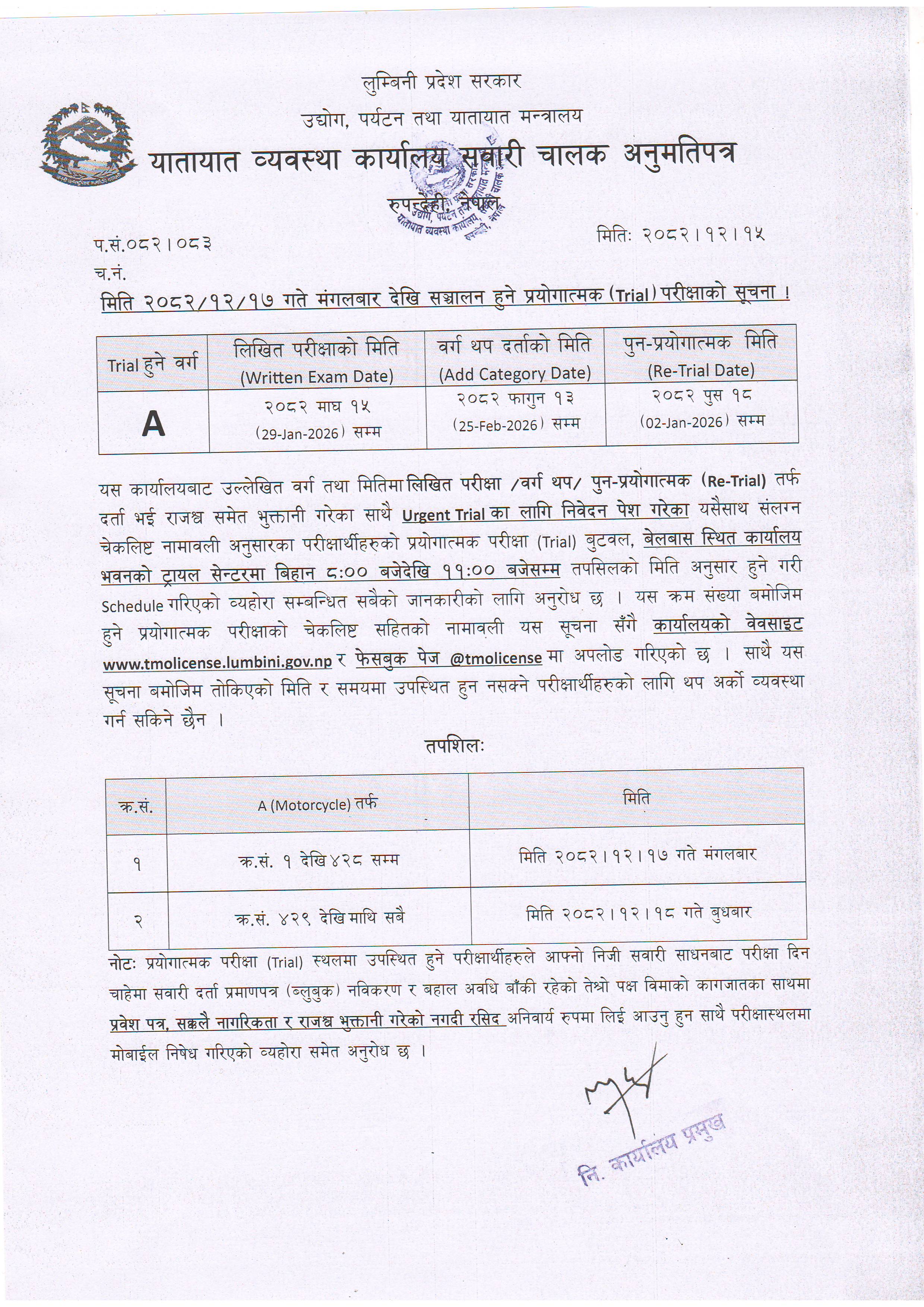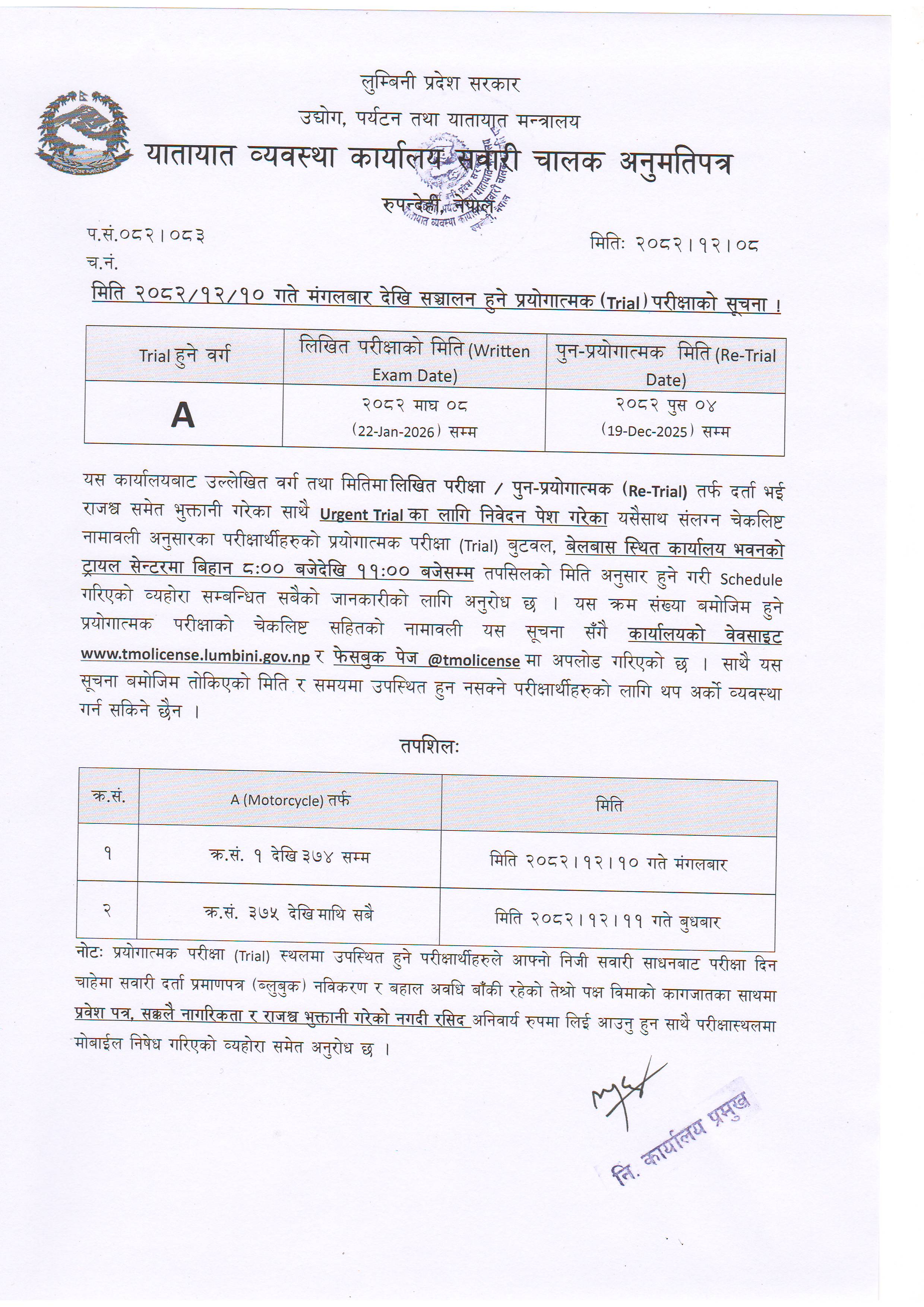 मिति २०८२।१२।१० गते मंगलबार देखि संचालन हुने वर्ग A तर्फको प्रयोगात्मक परीक्षाको सूचना