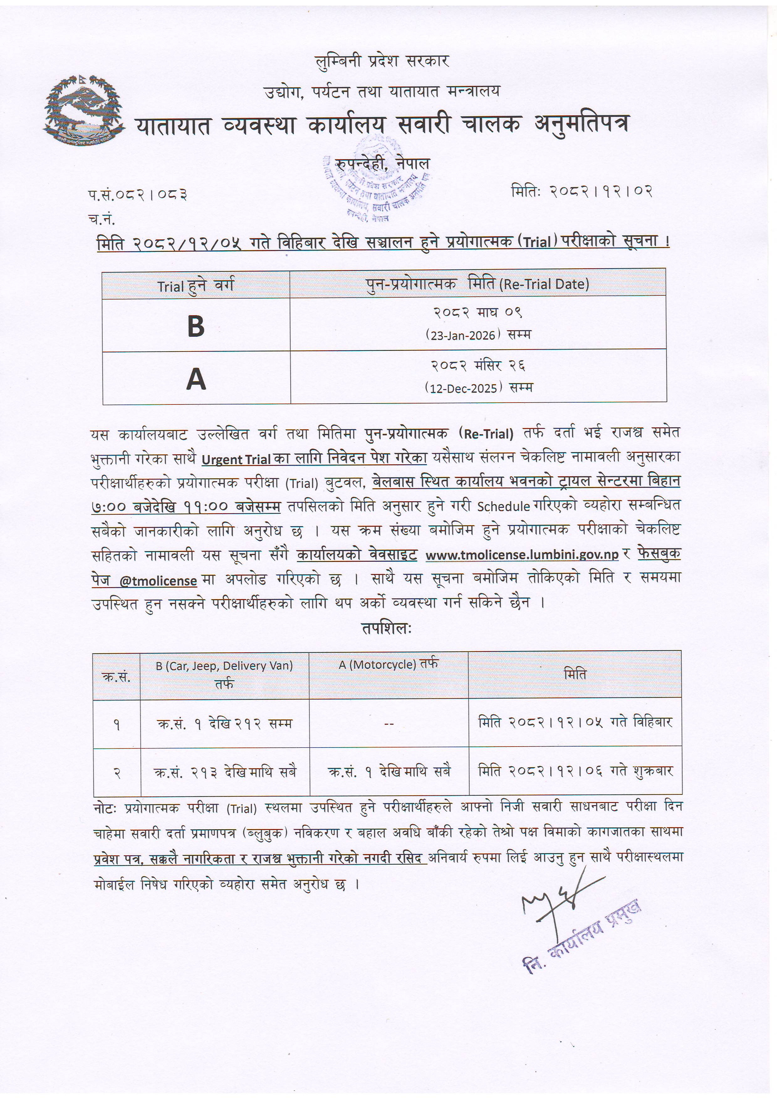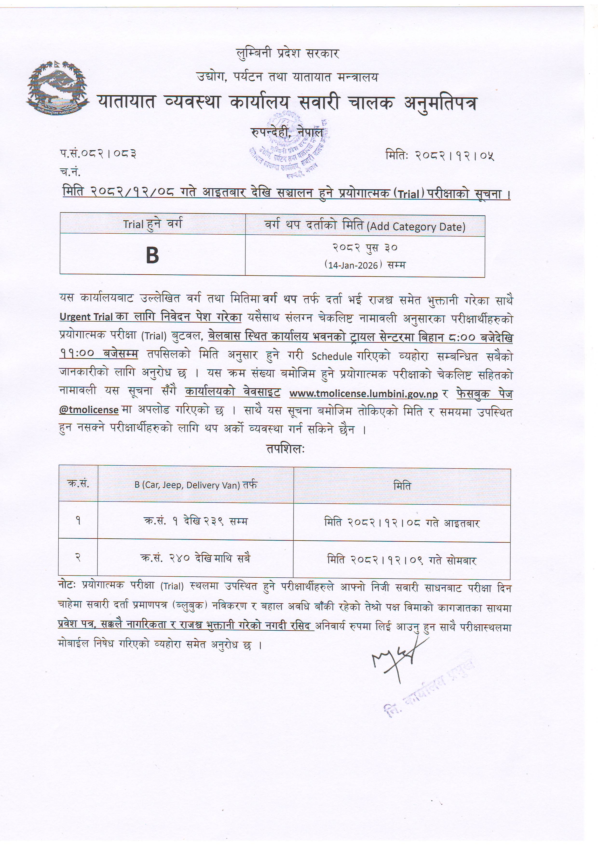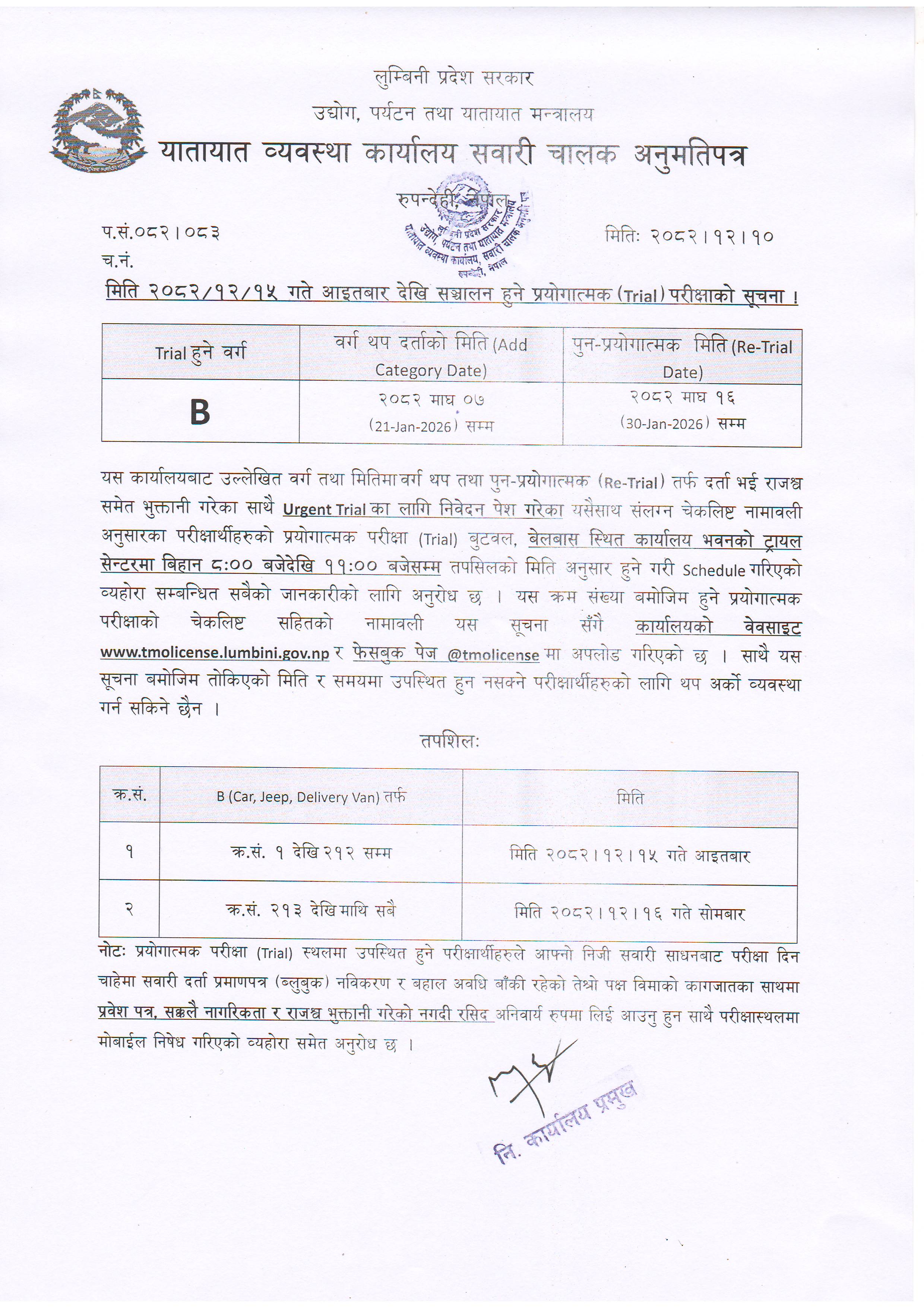 मिति २०८२।१२।२७ गते शुक्रबार संचालन हुने वर्ग B (Car, Jeep, Delivery Van) तर्फको प्रयोगात्मक परीक्षाको चेकलिष्ट नामावली साथै सूचना