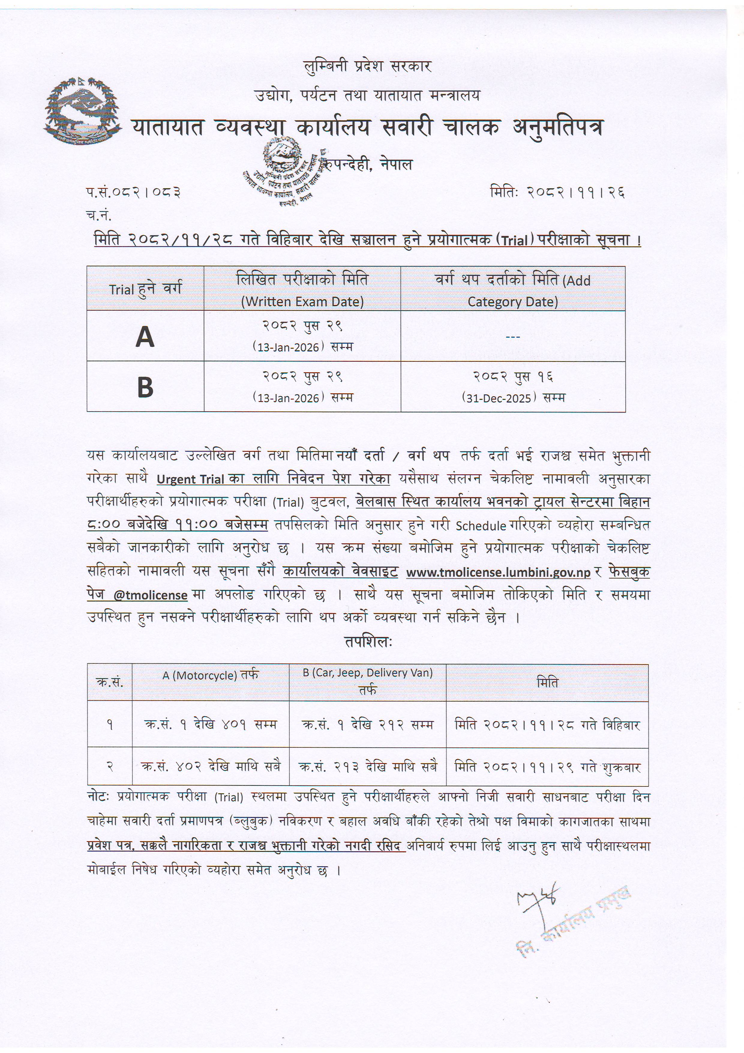 मिति २०८२।१२।२७ गते शुक्रबार संचालन हुने वर्ग B (Car, Jeep, Delivery Van) तर्फको प्रयोगात्मक परीक्षाको चेकलिष्ट नामावली साथै सूचना