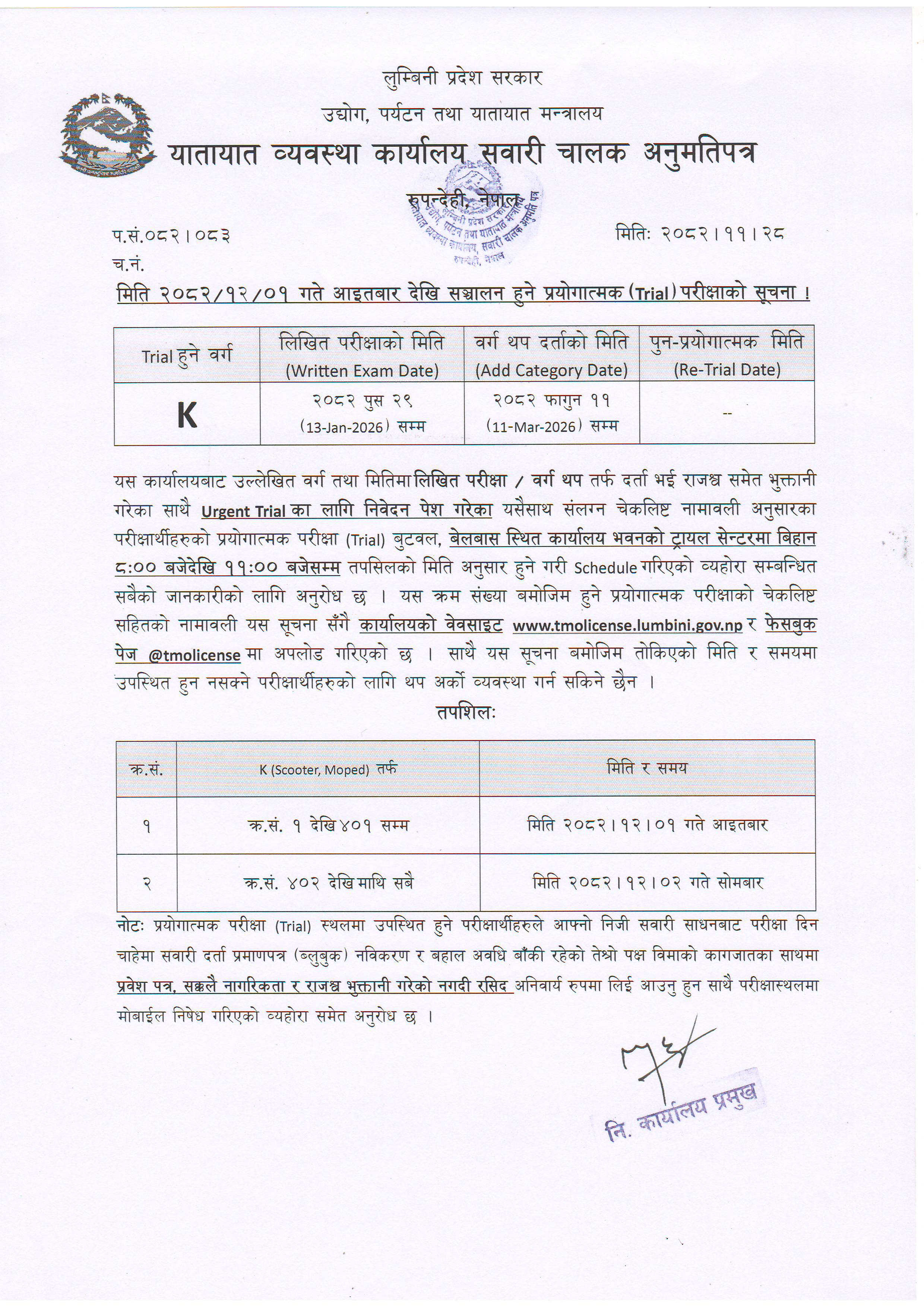मिति २०८२।१२।०१ गते आइतबार देखि संचालन हुने वर्ग K तर्फको प्रयोगात्मक परीक्षाको सूचना