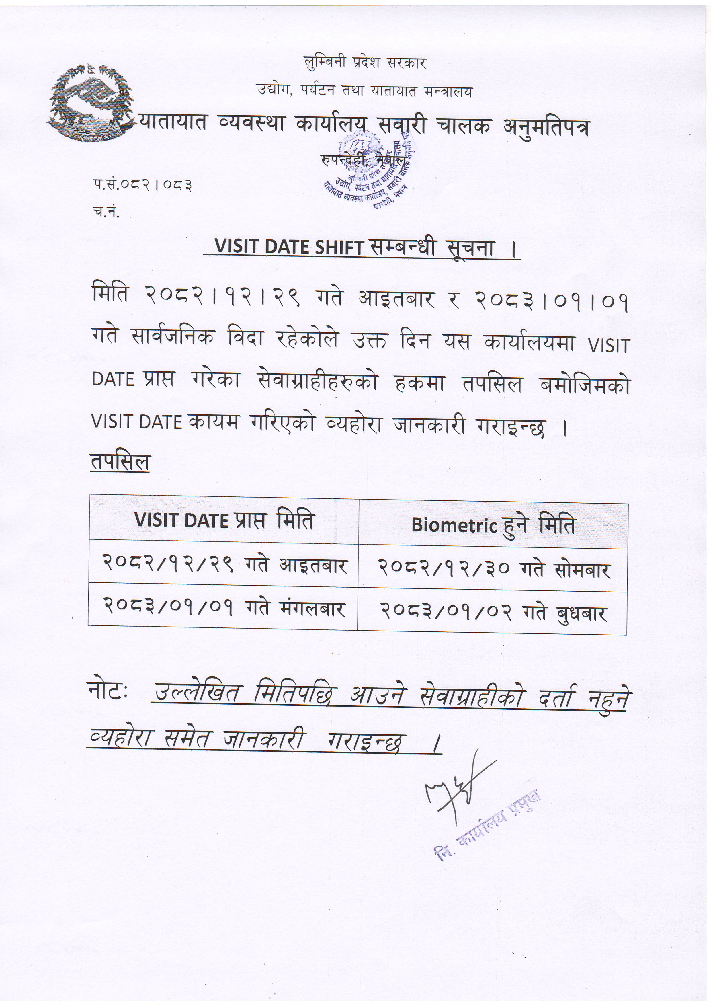 Visit Date Shift सम्बन्धी सूचना
