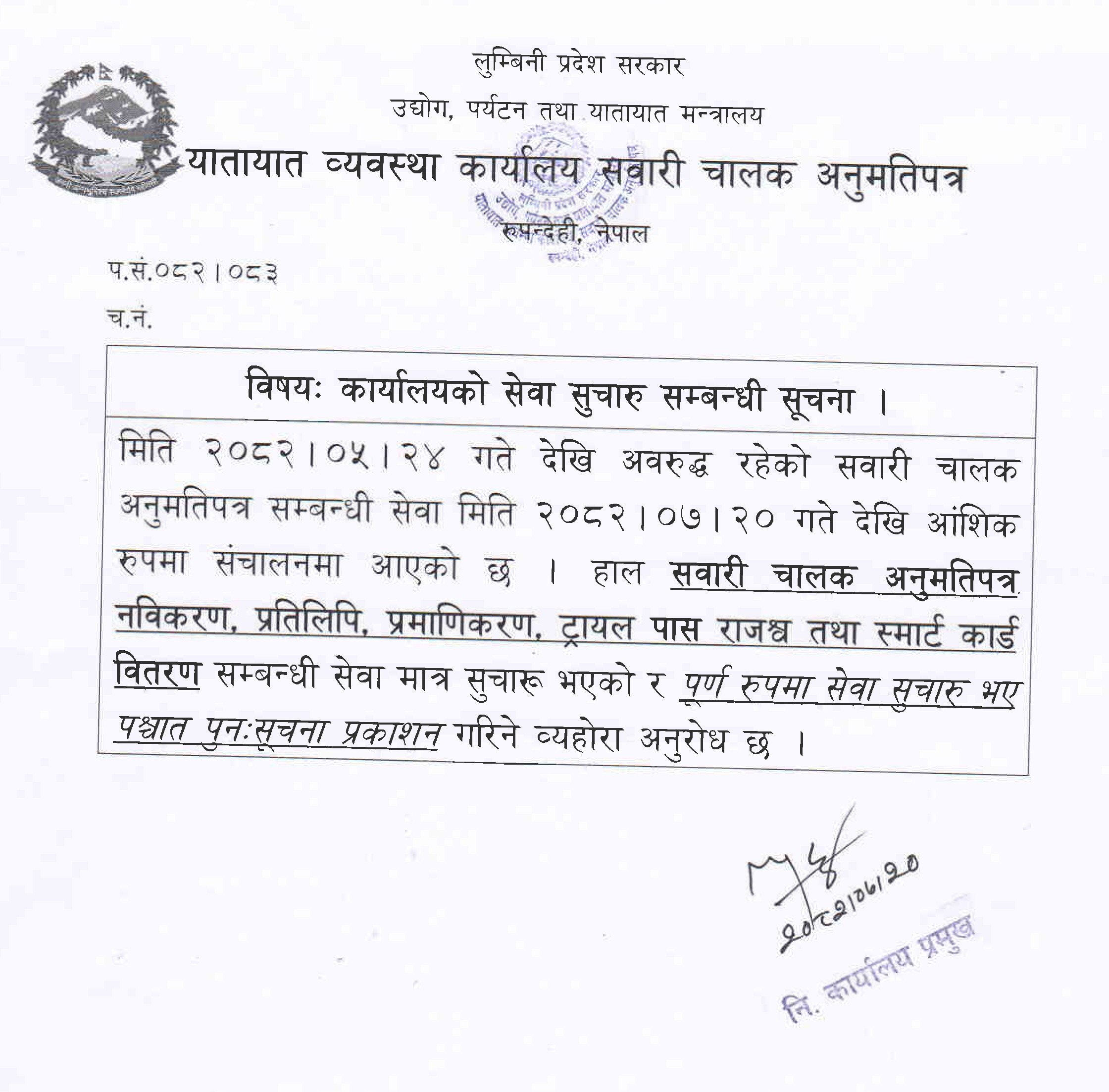 कार्यालयको सेवा आंशिक रुपमा संचालनमा आएको सम्बन्धी सूचना
