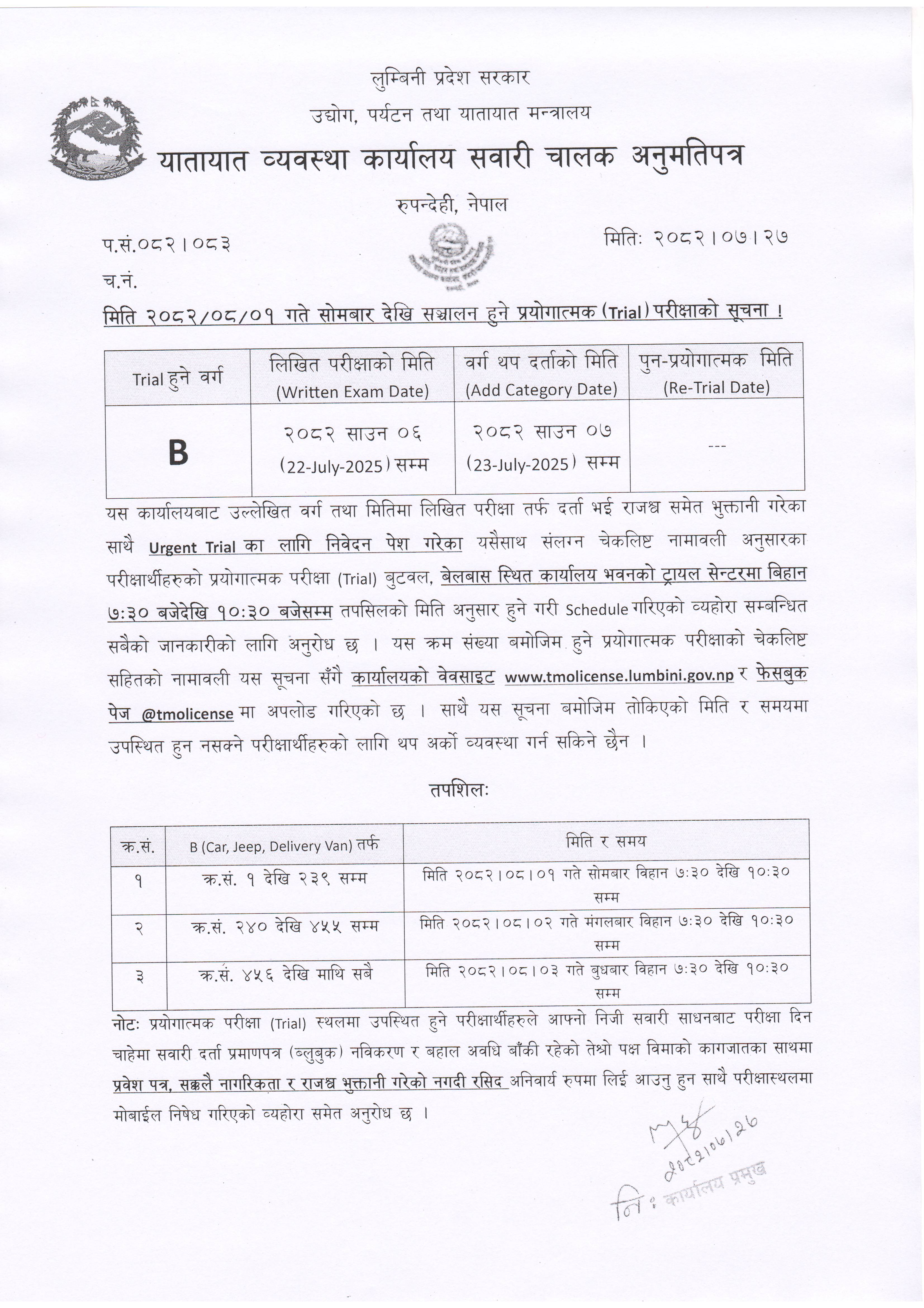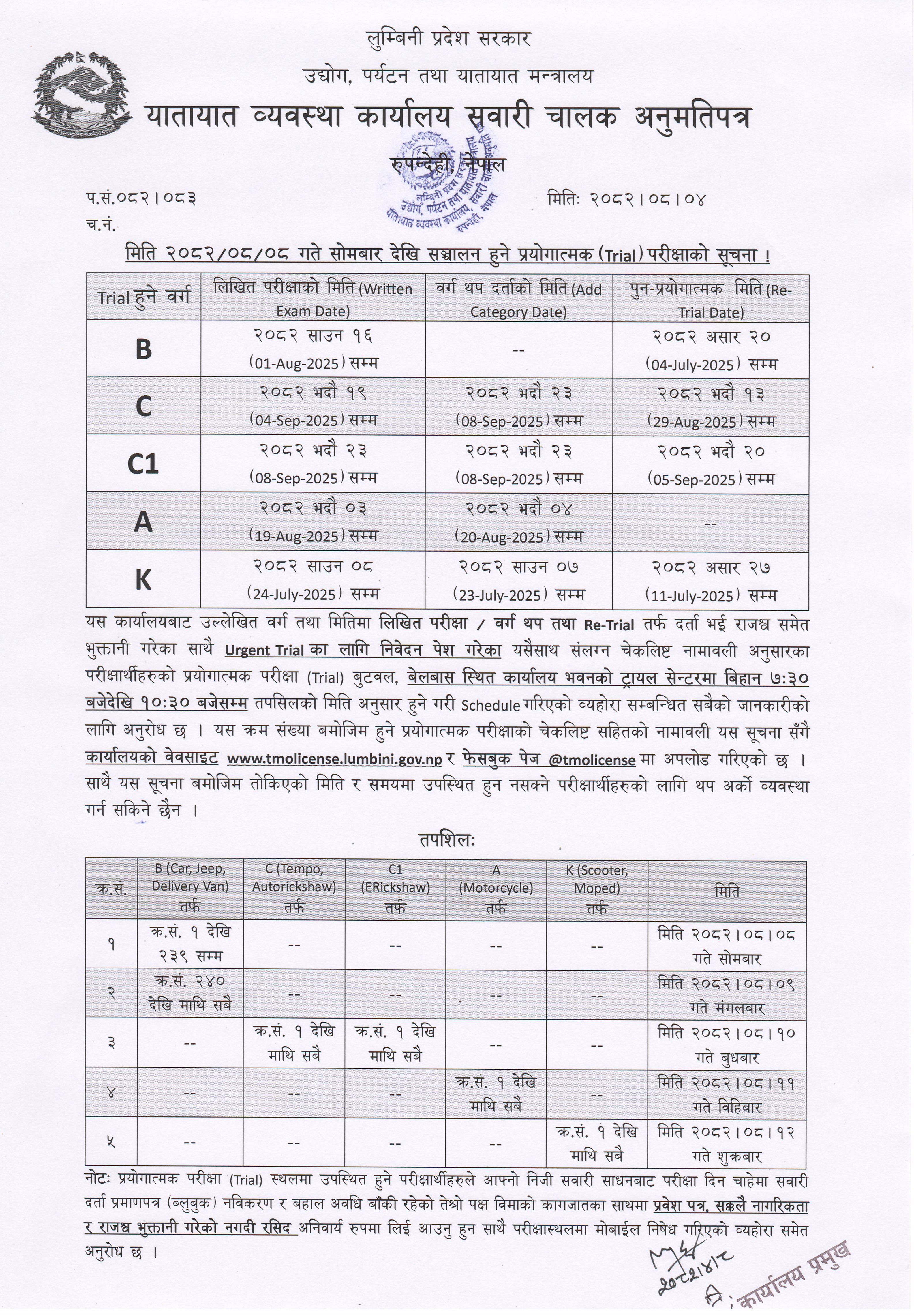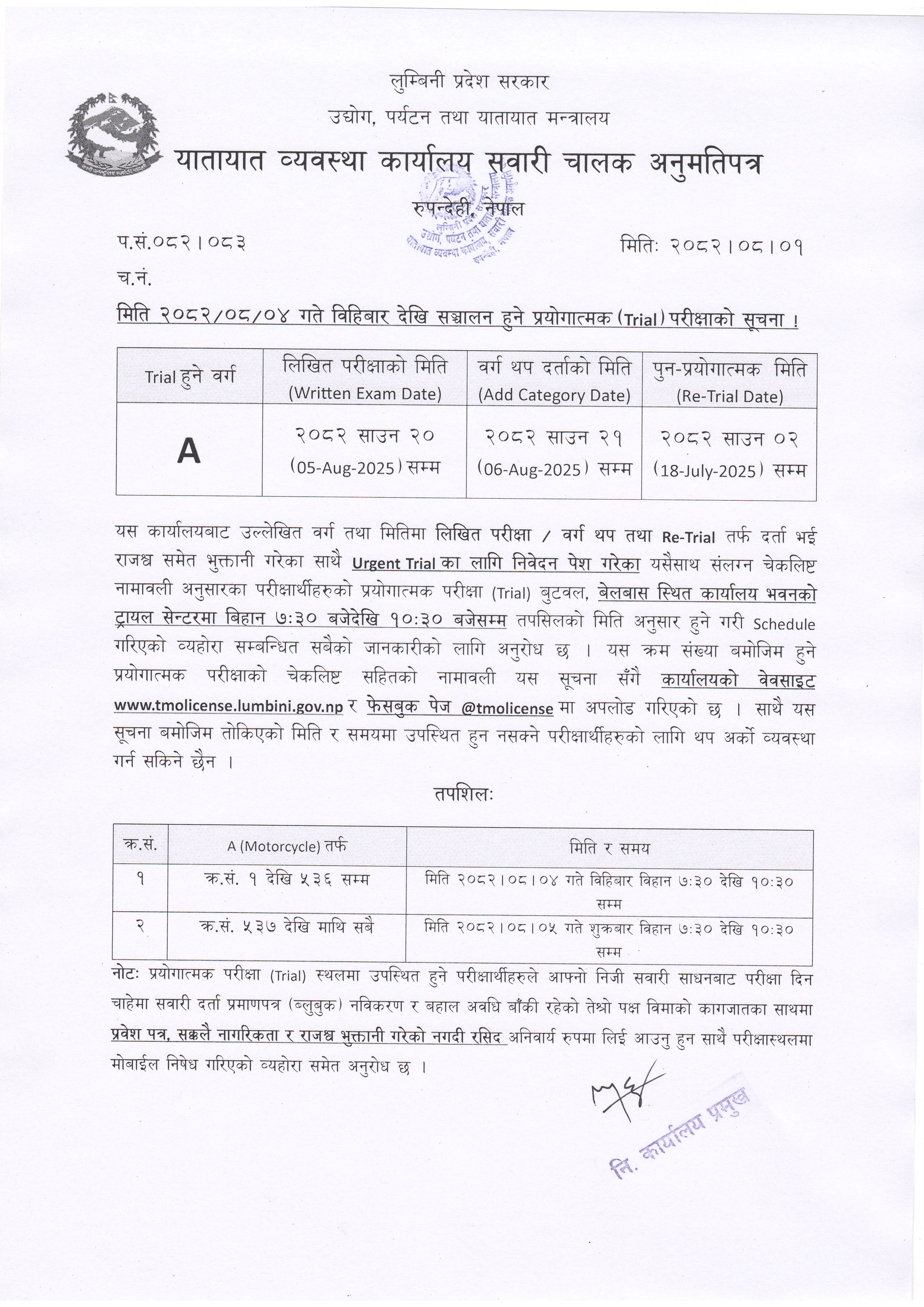 मिति २०८२/०८/०४ गते विहिबार देखि सञ्चालन हुने वर्ग A तर्फको प्रयोगात्मक परीक्षा (Trial Exam) सम्बन्धी सूचना