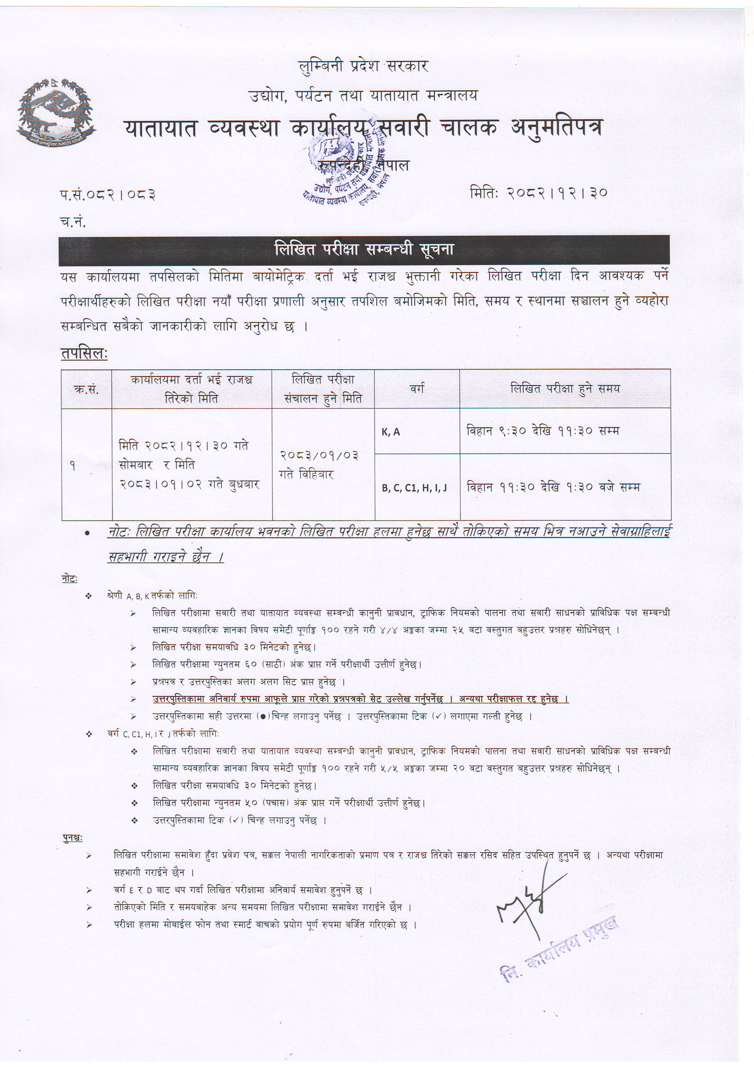 मिति २०८३।०१।०३ गते विहिबार संचालन हुने लिखित परीक्षा सम्बन्धी सूचना