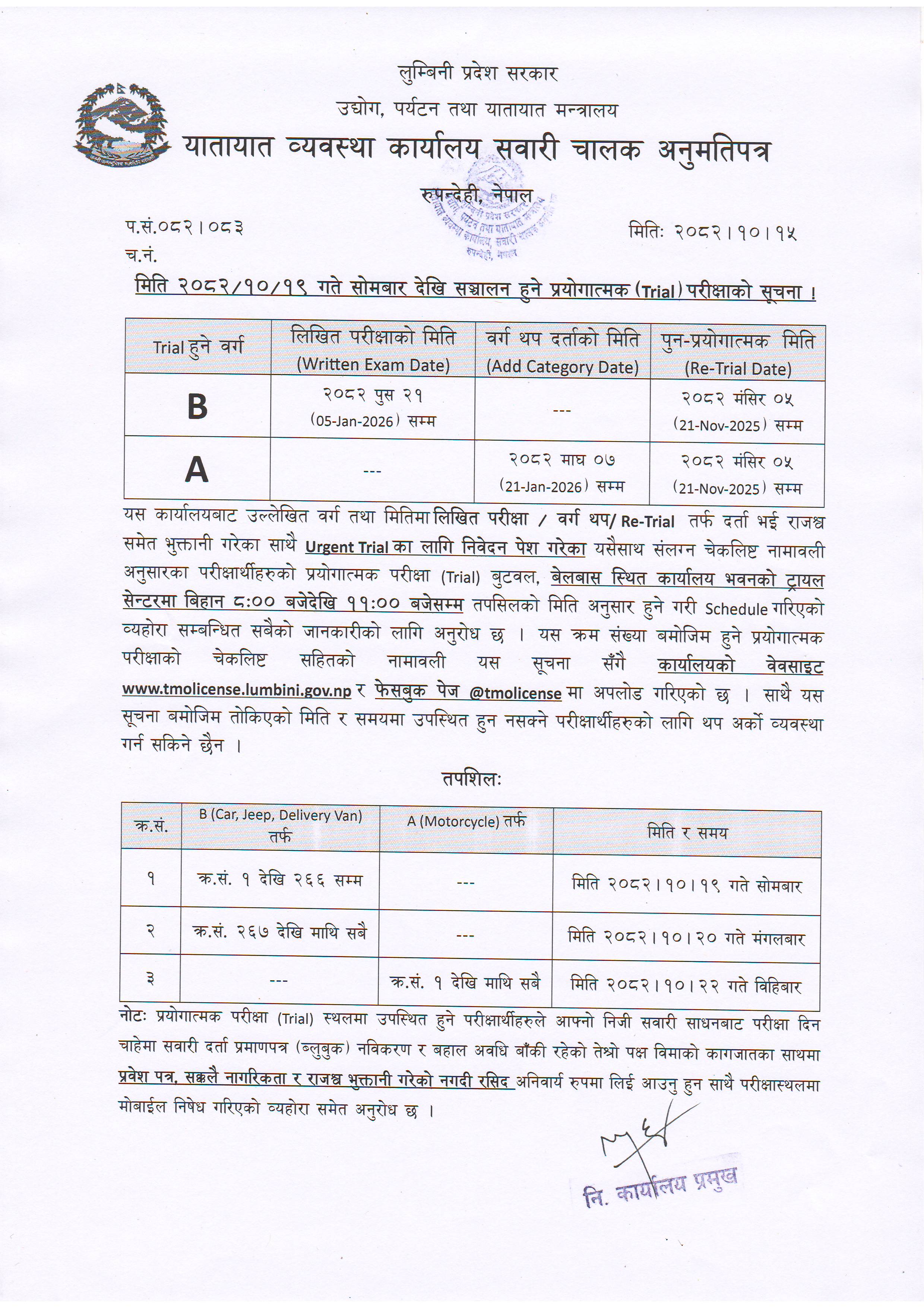 माघ १५, २०८२ मिति २०८२।१०।१९ गते सोमबार देखि संचालन हुने वर्ग A/B तर्फको प्रयोगात्मक परीक्षाको सूचना
