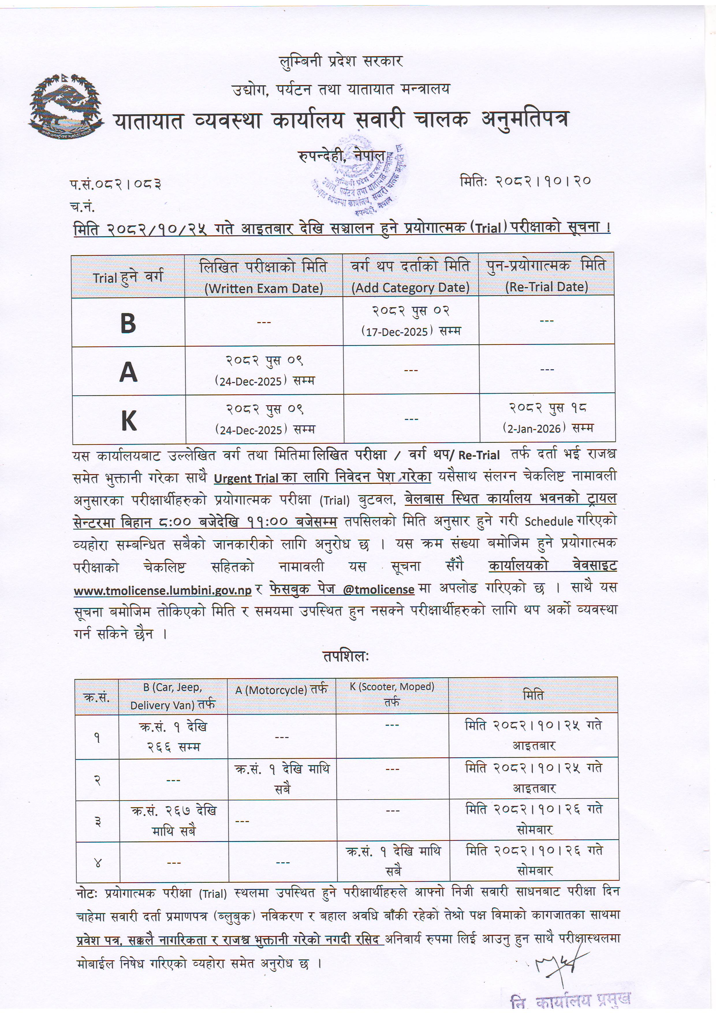 माघ २०, २०८२ मिति २०८२।१०।२५ गते आइतबार देखि संचालन वर्ग A/B/K तर्फको प्रयोगात्मक परीक्षाको सूचना