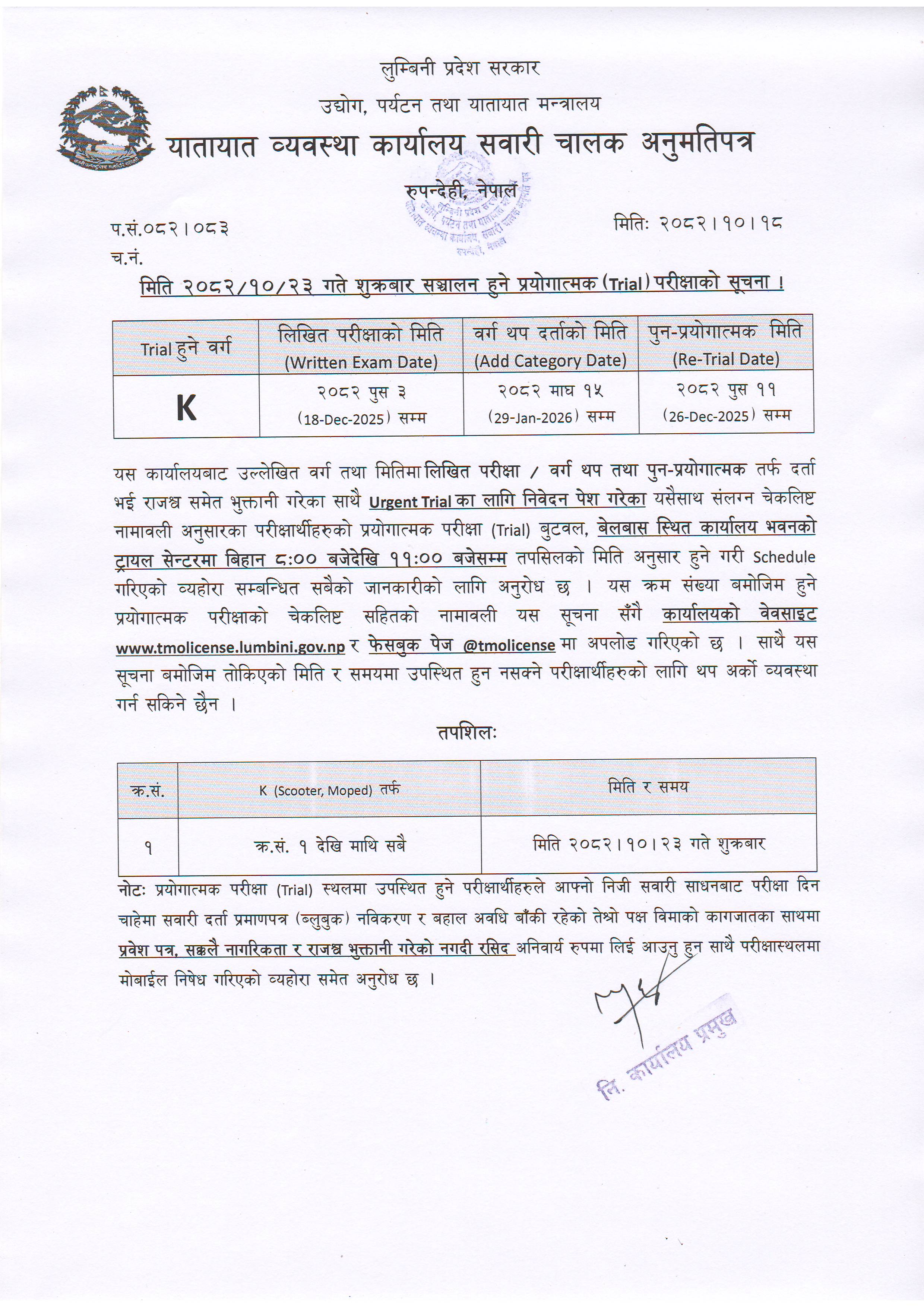 माघ १८, २०८२ मिति २०८२।१०।२३ गते शुक्रबार हुने वर्ग K को प्रयोगात्मक परीक्षाको सूचना