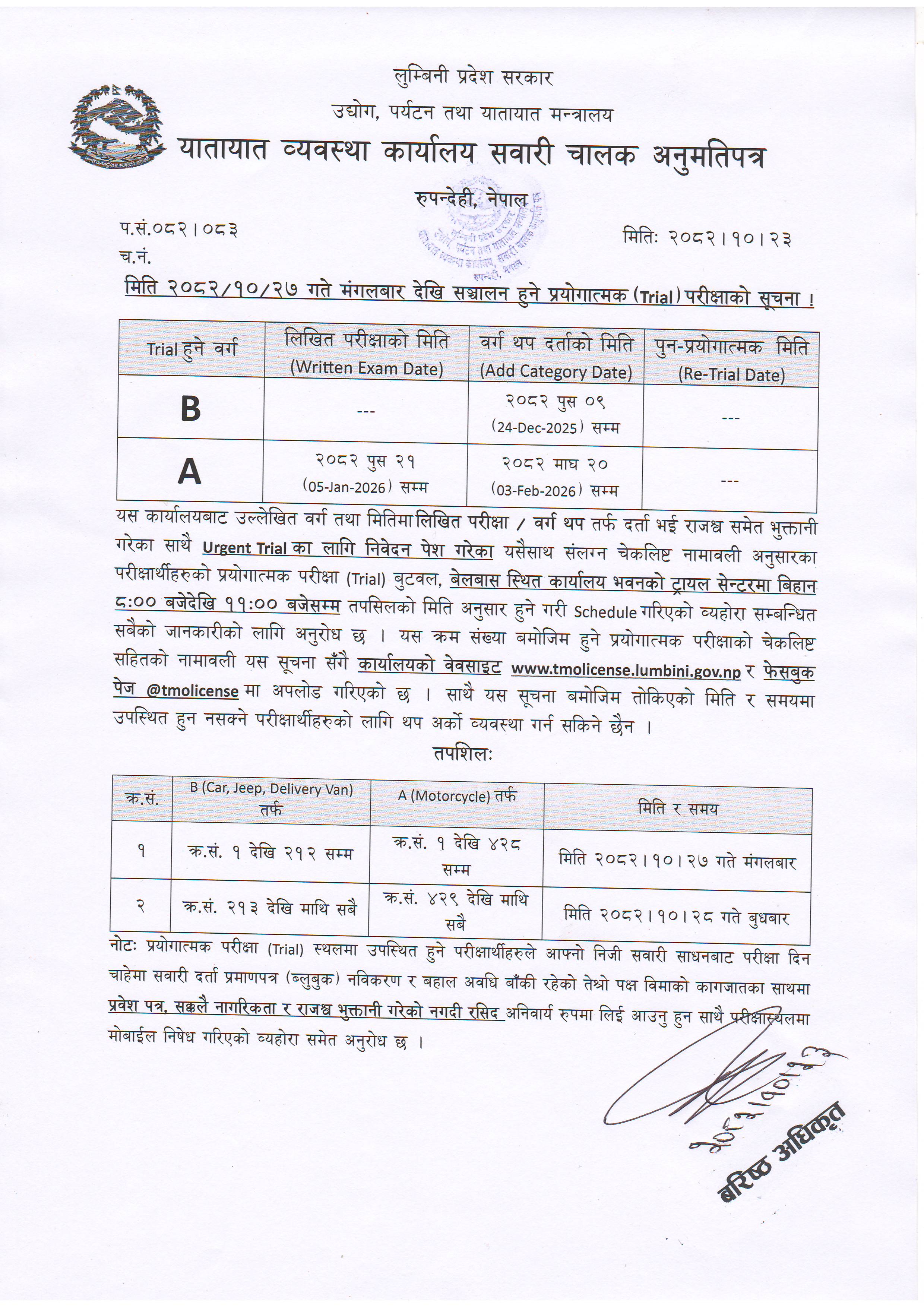 माघ २३, २०८२ मिति २०८२।१०।२७ गते देखि संचालन हुने वर्ग A/B तर्फको प्रयोगात्मक परीक्षाको सूचना