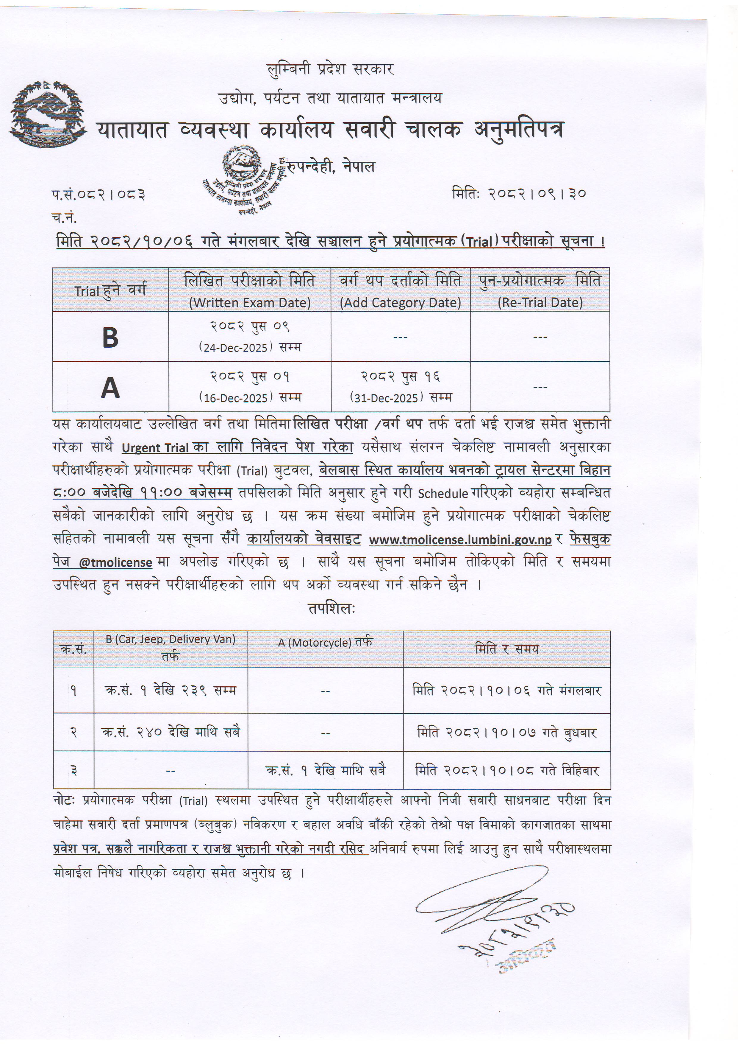 मिति २०८२।०९।२१ गते देखि संचालन हुने वर्ग B/K को प्रयोगात्मक परीक्षाको सूचना ।